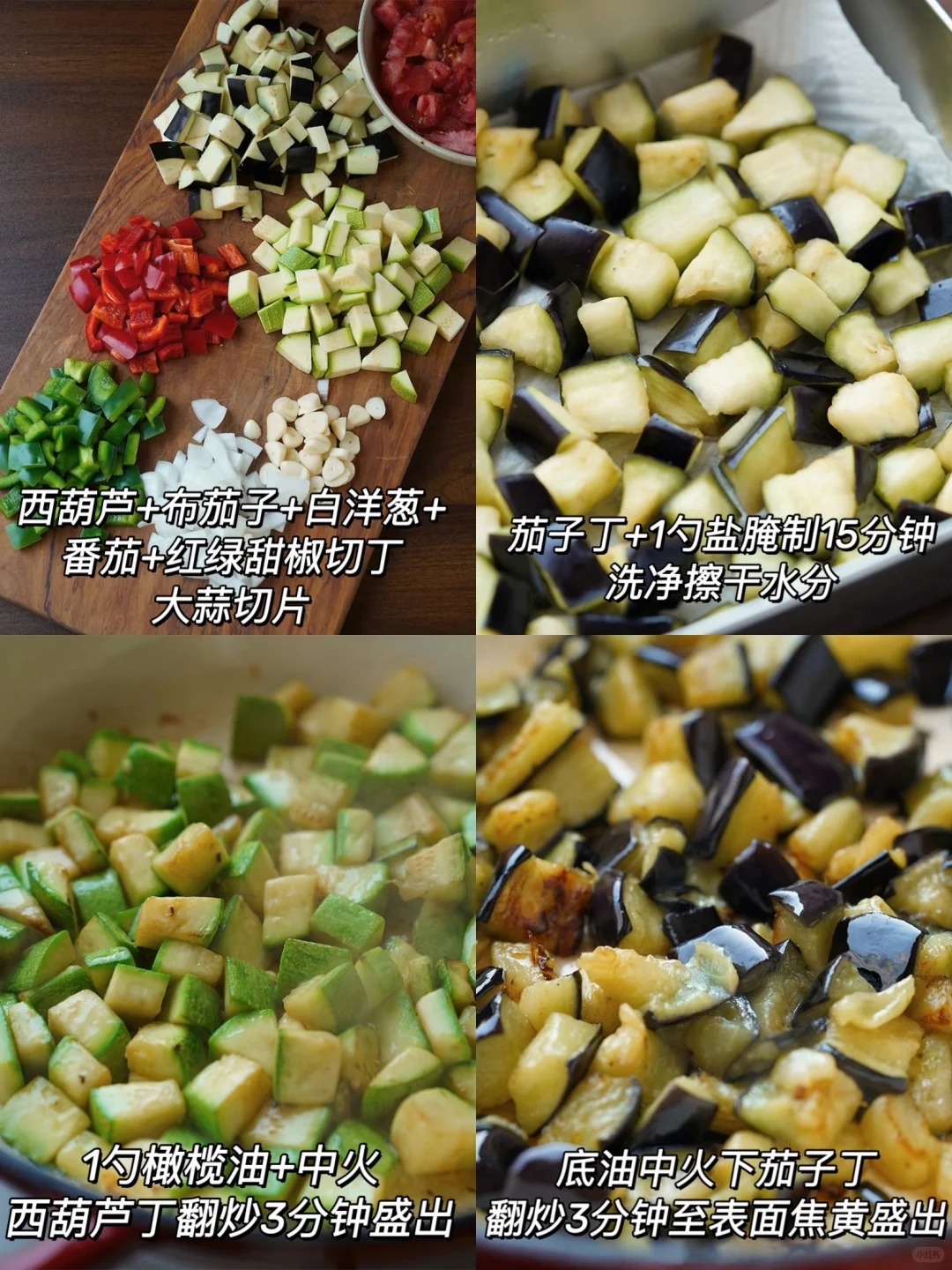 ▪️1根西葫芦+1根布茄子去头去尾切丁,半个白洋葱+4个番茄去皮切丁,6粒大蒜切片,1个绿甜椒+1个红甜椒去籽切丁。