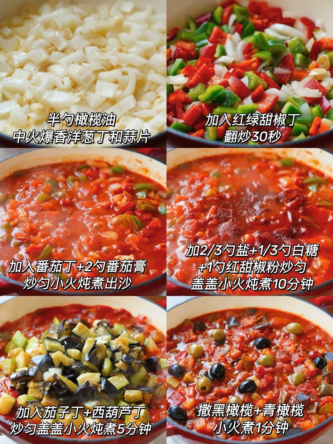 做法也很简单,把茄子、西葫芦炒到绵软,丢进锅里和番茄、欧洲橄榄一起炖到软烂。