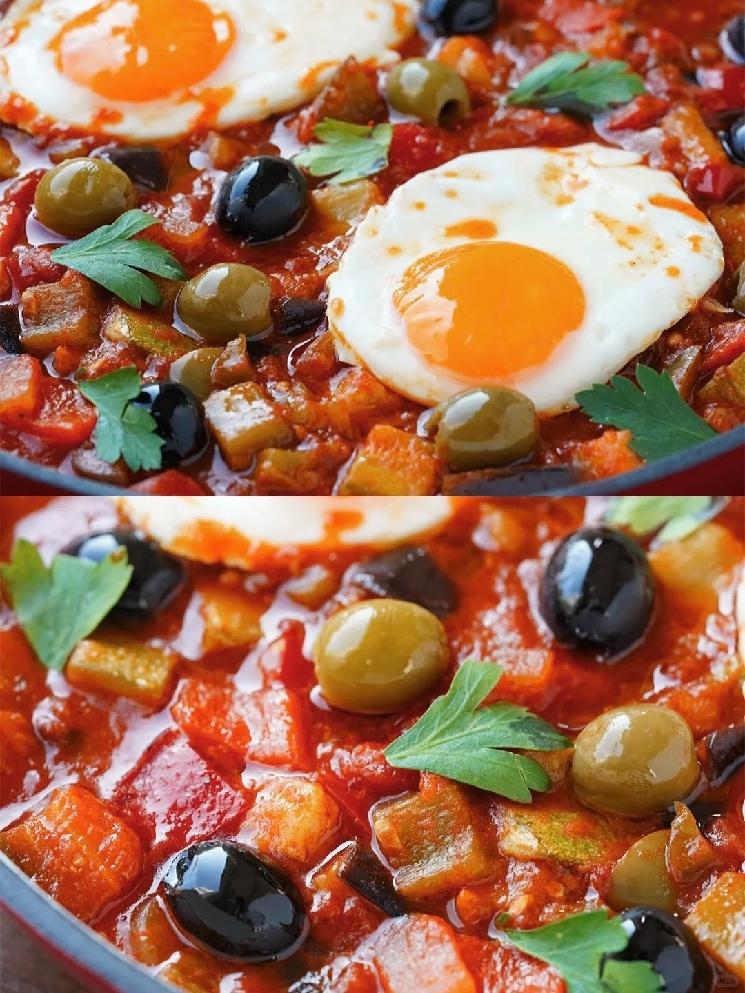 ▪️开盖,表面放上欧洲青橄榄+欧洲黑橄榄,小火煮1分钟。关火,放上煎蛋,撒上一小撮意大利香芹叶。